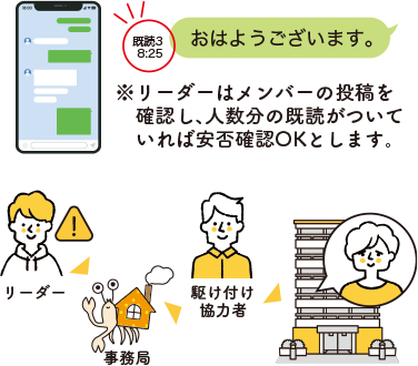 ③リーダーは発言も既読もつかない メンバーがいたら、事務局へ報告。駆け付けに協力していただける方に動いていただくよう要請します。