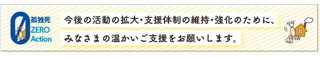 できても、社会的孤立という「原因」を除去することはできません。だから機械ではなく人が主人公となる取組みが必要とされています。 人と人が、互いにつながり、知りあい、見守りあうことで孤独死を防ぐ「孤独死ゼロアクション」。 参加することで「見守る」という役割が生まれ、「見守られる」ことにも意味づけがされ、日々の暮らしや心までもが豊かになっていきます。